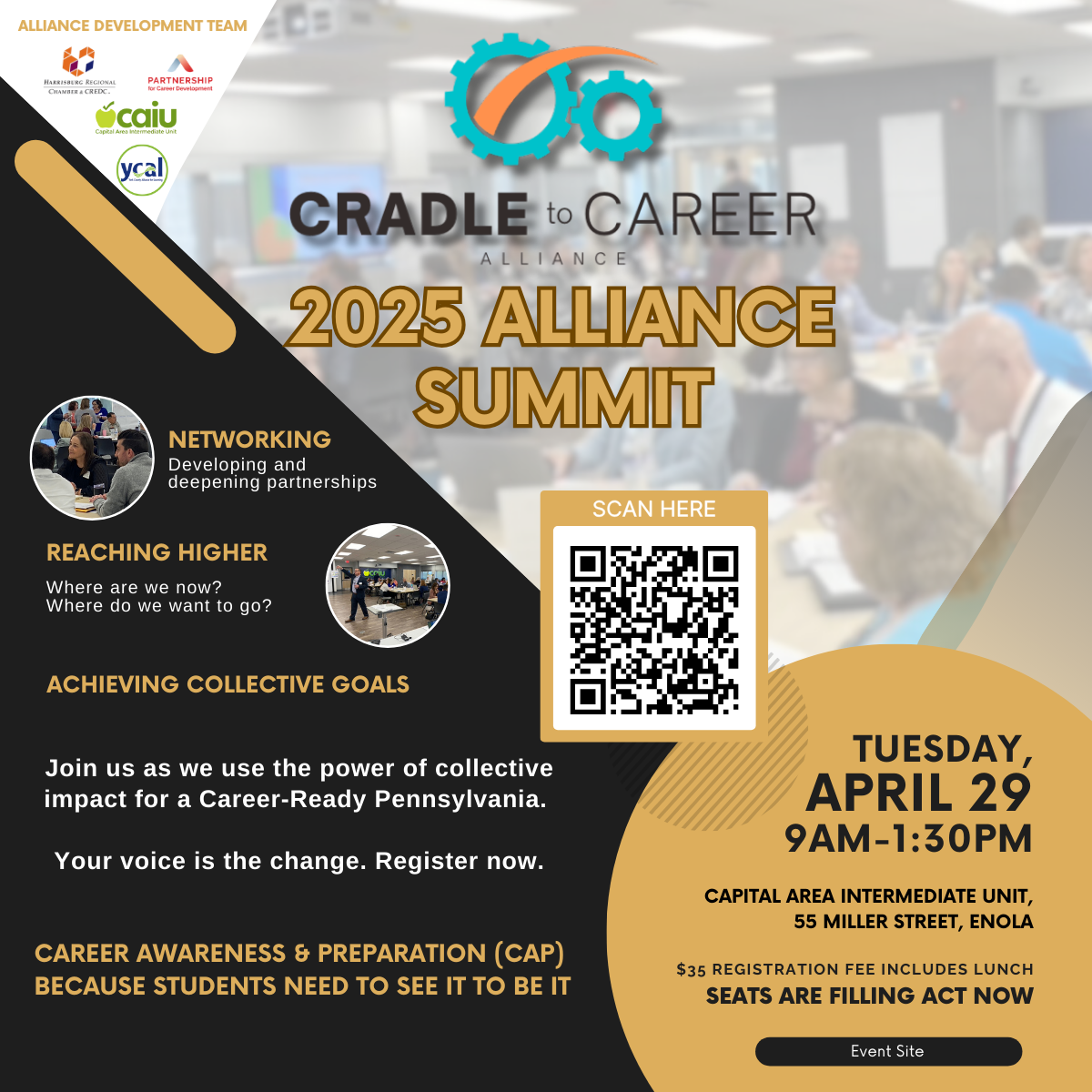 The Cradle to Career Alliance is a collective impact effort for Career Awareness & Preparation in S. Central PA. The Summit is the annual culmination of the great work accomplished during the year as well as a look ahead at future projects. This year's Summit features: Committee presentations on the Online Connector Platform, Alliance operations, and the October 15, 2025 Career Preparedness Expo, as well as A Look to the Future - strategies to continue growing our future workforce together!