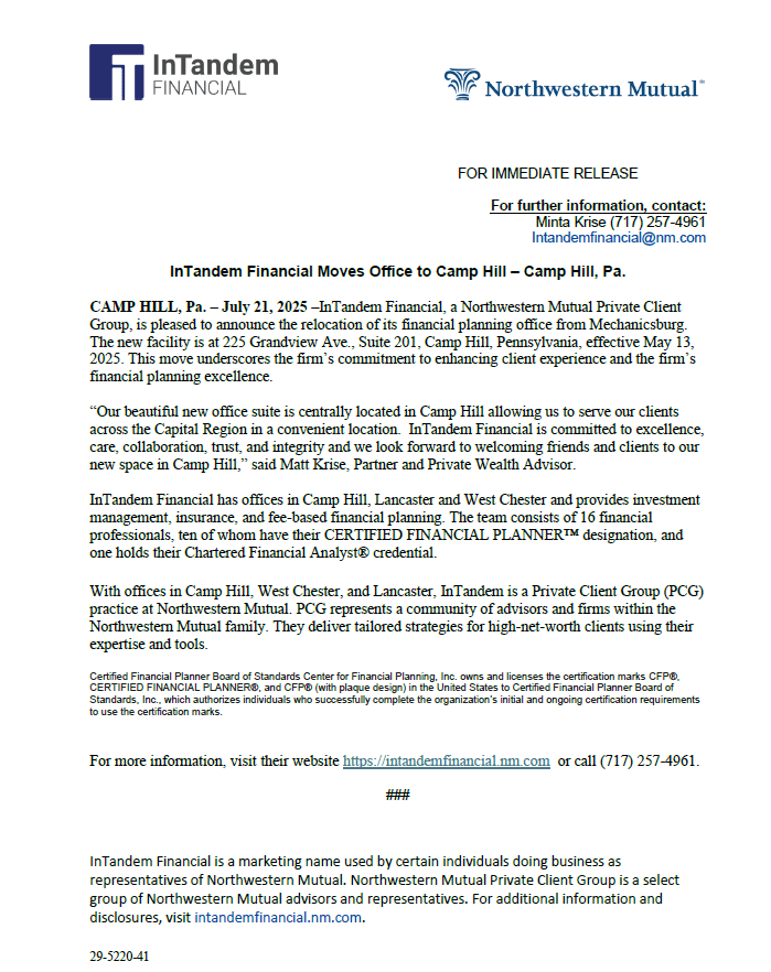 CAMP HILL, Pa. – July 21, 2025 –InTandem Financial, a Northwestern Mutual Private Client Group, is pleased to announce the relocation of its financial planning office from Mechanicsburg. The new facility is at 225 Grandview Ave., Suite 201, Camp Hill, Pennsylvania, effective May 13, 2025. This move underscores the firm’s commitment to enhancing client experience and the firm’s financial planning excellence.