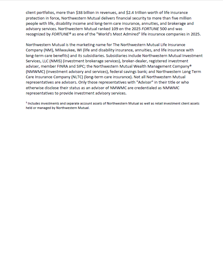 Northwestern Mutual has been helping people and businesses achieve financial security for more than 165 years. Through a comprehensive planning approach, Northwestern Mutual combines the expertise of its financial professionals with a personalized digital experience and industry-leading products to help its clients plan for what's most important. With nearly $700 billion of total assets1 being managed across the company's institutional portfolio as well as retail investment client portfolios, more than $38 billion in revenues, and $2.4 trillion worth of life insurance protection in force, Northwestern Mutual delivers financial security to more than five million people with life, disability income and long-term care insurance, annuities, and brokerage and advisory services. Northwestern Mutual ranked 109 on the 2025 FORTUNE 500 and was recognized by FORTUNE® as one of the "World's Most Admired" life insurance companies in 2025.