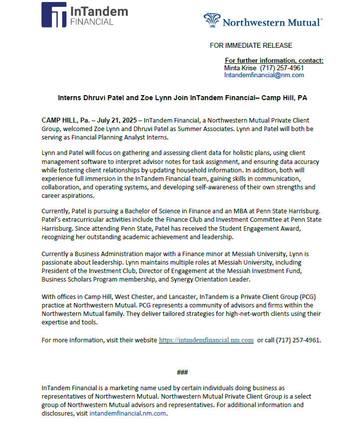 CAMP HILL, Pa. – July 21, 2025 – InTandem Financial, a Northwestern Mutual Private Client Group, welcomed Zoe Lynn and Dhruvi Patel as Summer Associates. Lynn and Patel will both be serving as Financial Planning Analyst Interns.