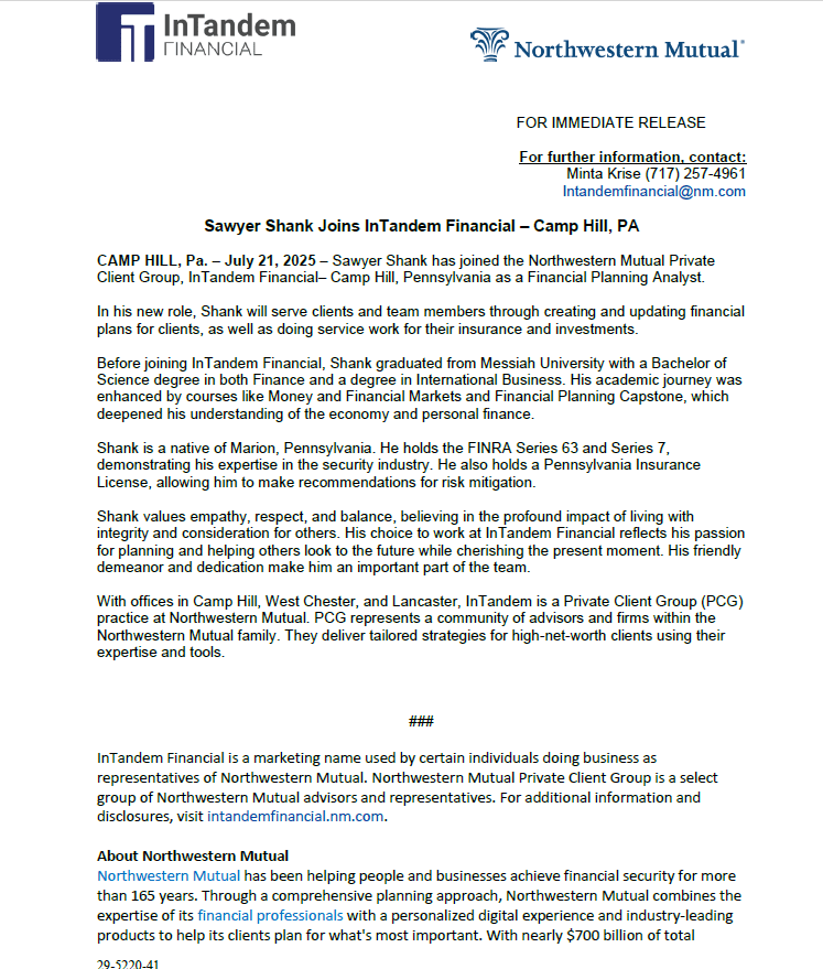 CAMP HILL, Pa. – July 21, 2025 – Sawyer Shank has joined the Northwestern Mutual Private Client Group, InTandem Financial– Camp Hill, Pennsylvania as a Financial Planning Analyst.